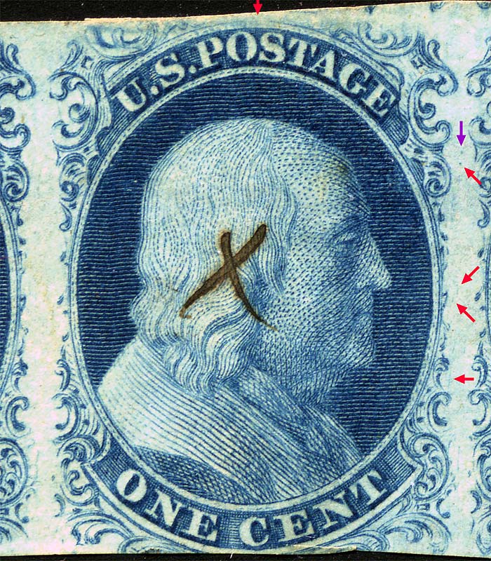 1¢ Franklin Issue of 1851-1857, PLATE 1 EARLY Position 14L1E, (Scott #7) |