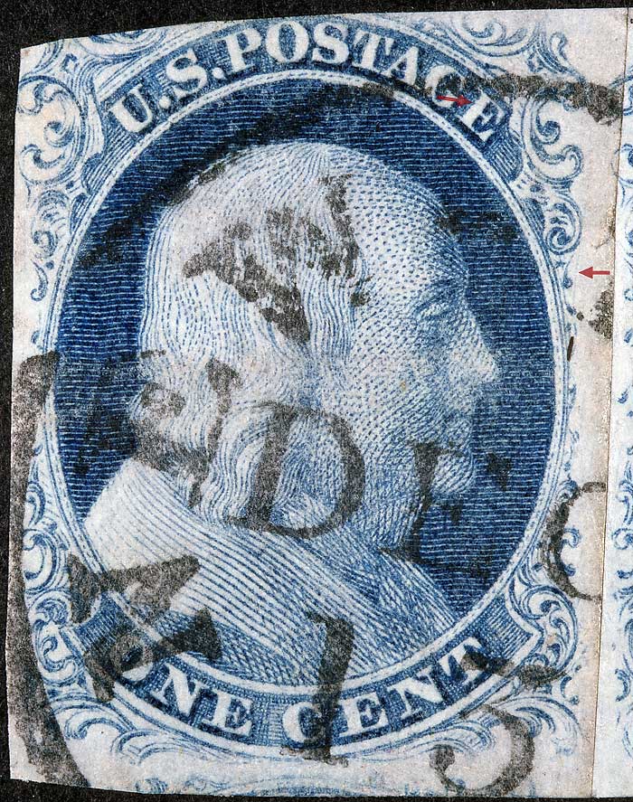 | Scott #7 Blue, Type II, Relief A First Condition Only Issued Imperforate This image is part of a reconstructed strip of 3 consisting of 15L1E, 16L1E and 17L1E. PLATING NOTES: The plating diagram for this position also illustrates a vertical line between Ornament A and Ornament B and a vertical line between Ornament L and Ornament M. These lines cannot be seen on these images and may simply not be consistent or only reveal themselves on sharper impressions. There also is a faint line of color in the E of POSTAGE (red arrows below) which is not illustrated in the Neinken diagram but appears consistent in the archive images. Courtesy of Tim McRee |