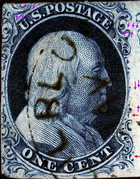 | Scott #7 Blue, Type II, Relief A First Condition Only Issued Imperforate This image is part of a horizontal strip of 3 consisting of 18L1E, 19L1E, 20L1E. The plating marks shown in Neinken are faint, worn away or not fully formed on this impression, but other unconfirmed marks are shown and it is hoped that other students of this issue can confirm. See violet arrows below. Also take note that Ornament P and the small unnamed ornament below it are weak and incomplete. This is shown in the plating diagrams but not detailed as a plating aid. |