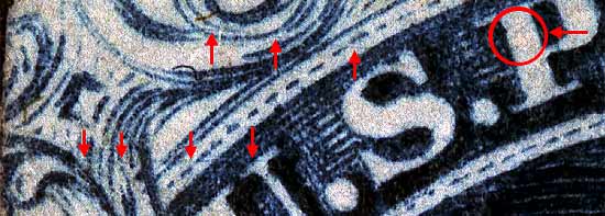 | Figure 1. (Below) Close up detail of the blur mark shown in Neinken plating diagram (circle). The sharp horizontal lines of color above the U and S are not shown in the plating diagrams.