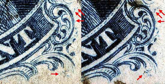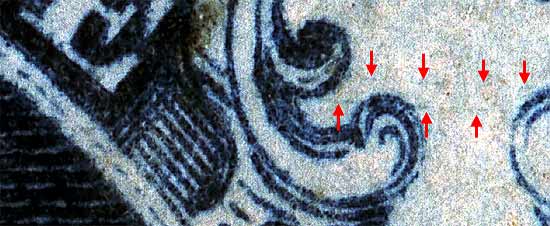| Figure 3. (Below) Close up detail of the remains of the small unnamed ornament extending from Ornament R. There is also a small dot in the lower plume remains. This is not illustrated in the plating diagrams and may not be constant on later impressions.