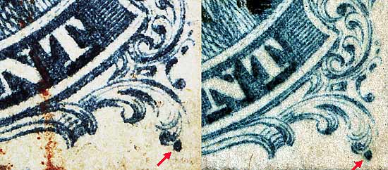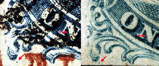 | Figure 1. (Below) Small dot on the inside of the left plume remains as illustrated in the Ashbrook/Neinken plating diagrams. The plating digrams also illustrate small dots in the N and E of ONE. These copies do not show these marks well or at all.