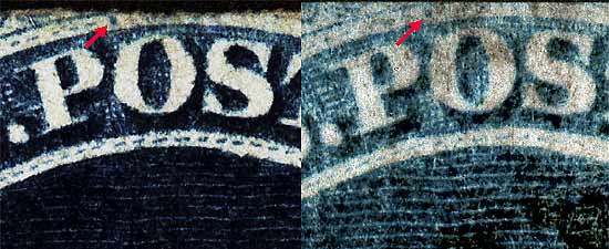 | Figure 3. (Below) NEW PLATING MARK. A heavy dot above and to the left of the O of POSTAGE. This is not illustrated in the plating diagrams but is confirmed here as consistent. This mark MAY appear on 29L1L but the archive does not have this position as of this date.