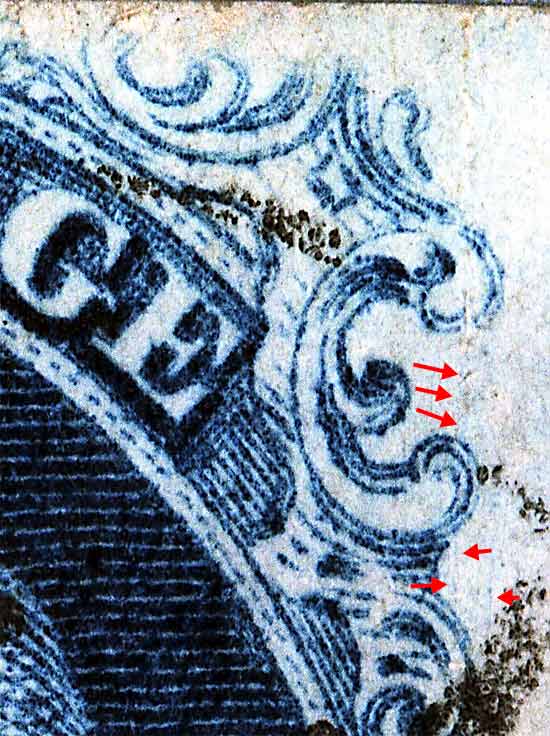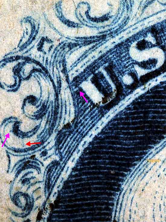| Figure 2. Red arrows indicates a faint vertical blurry line which the Ashbrook/Neinken plating diagrams show as a dot. The violet arrows merely indicate marks of interest and may not be constant.