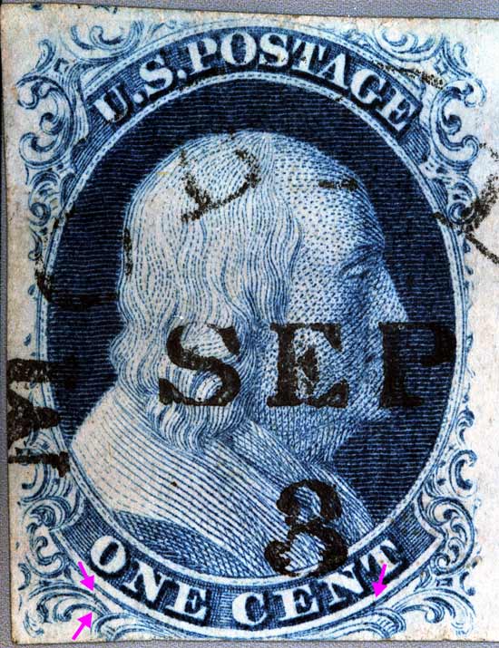 1¢ Franklin Issue of 1851-1857, PLATE 1 EARLY Position 34L1E, (Scott #7) |