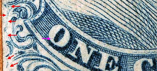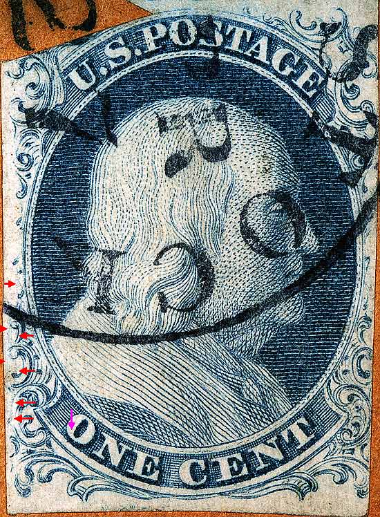 1¢ Franklin Issue of 1851-1857, PLATE 1 EARLY Position 43L1E (Scott #7) |