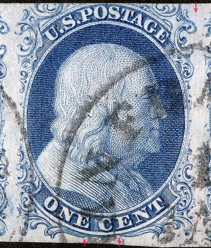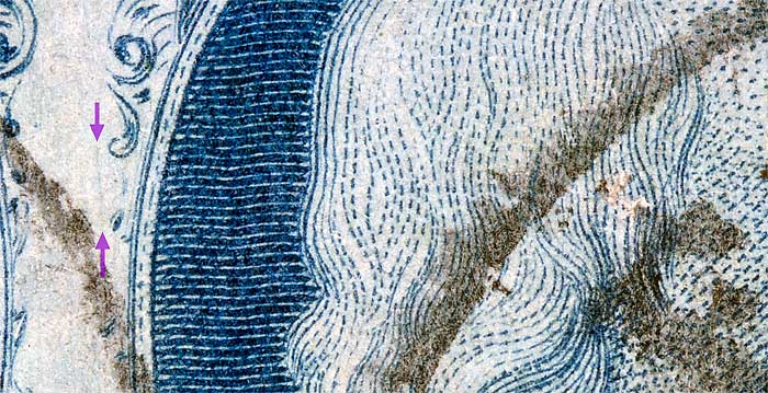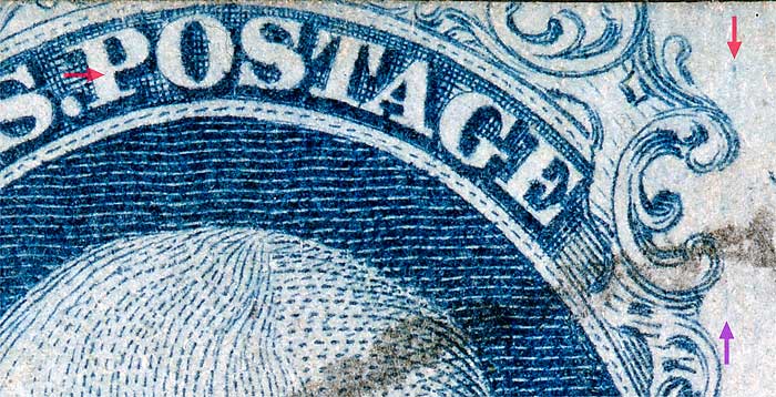| Figure 1. (BELOW). Small blurry dot of color plating mark as illustrated in the Neinken/Ashbrook plating diagrams. Vertical line of color below Ornament M (violet arrows) not confirmed as consistent.