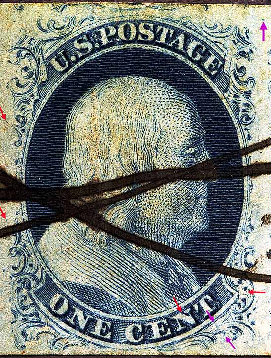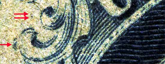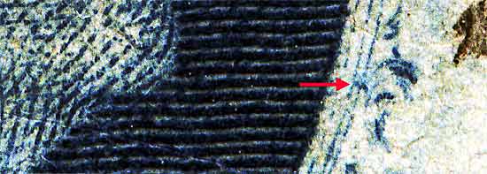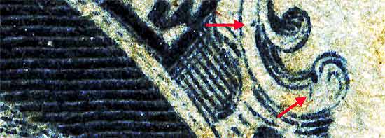 | Figure 4. Close up detail of plating marks in Ornaments "F" and "G." (red arrows).