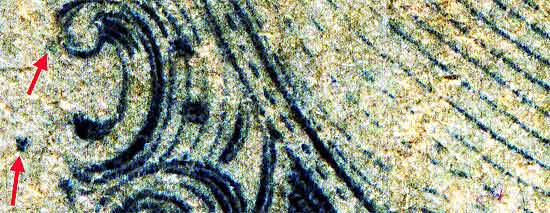 | Figure 2. Close up detail of 2 small plating marks inside of Ornament "M" (red arrows).