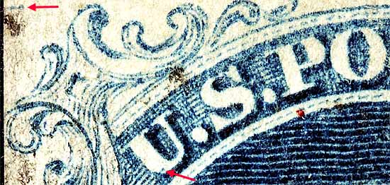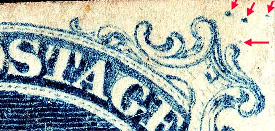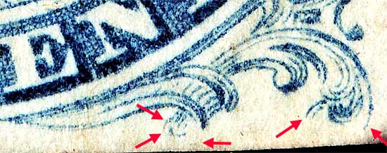 | Figure 3. (Below) Detail of partial lower right plume. The right scroll is complete but the scroll ball has not been completely entered onto the plate.