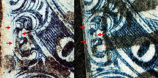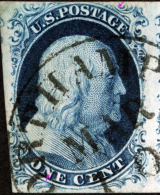 | Scott #7 Blue, Type II, Relief A Only Issued Imperforate This image is part of a horizontal strip of 3 consisting of 78R1E, 79R1E and 80R1E. The violet arrows are marks of interest not illustrated in the plating diagram but have been confirmed as consistent. |