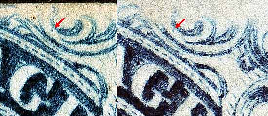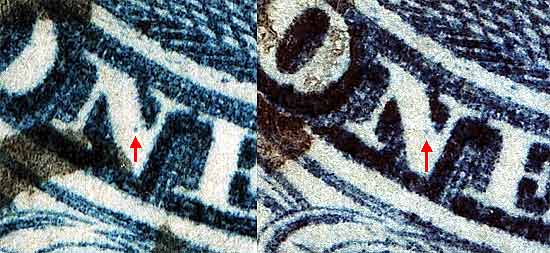 | Figure 1. (Below) A heavy grouping of plate scratches located in Ornament "H" and not illustrated in the plating diagrams. These marks have been confirmed as constant. Also see 78R1L to see how these marks have worn on Plate 1Late.
