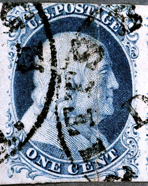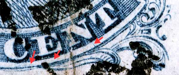 | Figure 1. (below) Detail of several faint plating marks. The guide dot is unfortunately covered by cancellation ink.