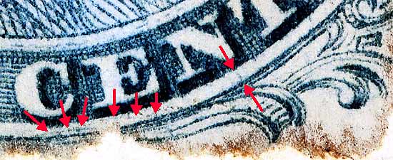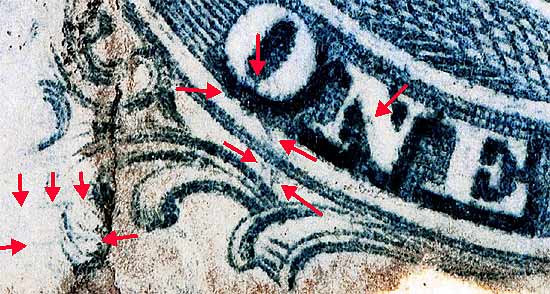 | Figure 2. (below) Detail of several faint plating marks. The most obvious mark is below the "O" of "ONE" and extends into white area above left scroll.