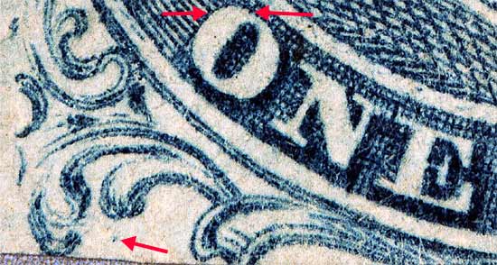 | Figure 1. (Below) Location of Ashbrook / Neinken plating mark in the "O" of ONE. It is not observable on this copy. The other plating mark can be seen between the left plume and scroll.
