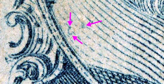 | Figure 2. (Below) A faint CURL and blurry dot in shoulder. It is not known if this is consistent and the archivist would be interested in hearing from other students of this issue if this mark exhibits itself on other copies of this position.