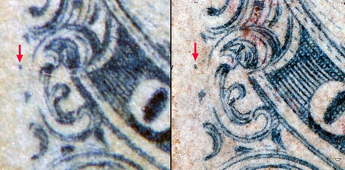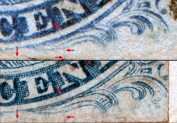 | Figure 2. (Below) A dot of color below the CE of CENT and a nearly vertical plate scratch between the EN of CENT not illustrated in the plating diagram but confirmed here as consistent. The dot below the CE of CENT is part of the 11th row effect can be seen nicely on Position 97R1E. Underneath most of the "misplaced A reliefs", and particularly visible on Plate 1Early, are the remnants of the top of the "B" relief - which was beneath "A" on the transfer roll. Position 97R1E shows by far the strongest evidence of this. It is very remarkable on the early state, but still quite evident on the Late state.