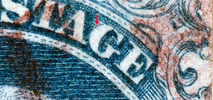 | Figure 3. (Below) Small dot of color inside the G of POSTAGE as illustrated in the Ashbrook/ Neinken plating diagrams.