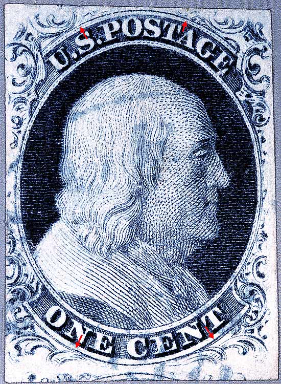 Figure 1. (Below) The upper right Ornaments, "Z, L, M, and N," are slightly doubled. The red arrows indicate the approximate starting and stopping points of the recut curved lines. There is also a dot in the left margin indicated on the plating diagrams which has been cut off this copy. |