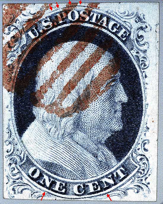| Scott #9 Blue, Type IV, Relief A Issued both imperforate and perforated. Perforated copies are more scarce. DOUBLE TRANSFER Figure 1. (Below) The upper right Ornament, "L," and the small unnamed Ornamnet is slightly double transfered. The red arrows indicate the approximate starting and stopping points of the recut curved lines. The top recut line is low over the "P" of POSTAGE and high over "O." |