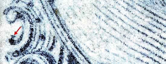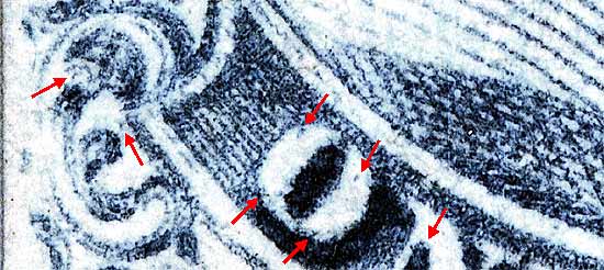 | Figure 1. (Below) Detail view of DOUBLE TRANSFER marks found in Ornament "H" and the "O and N" of ONE. The amount and variety of marks, make this position very easy to identify.