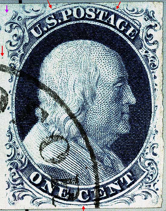 | Scott #9 Blue, Type IV, Relief A Issued both imperforate and perforated. Perforated copies are more scarce. SINGLE RECUT TOP Figure 1. (Below) Early impressions will show horizontal plate scratches below the lower left and right scrolls. The red arrows indicate the approximate starting and stopping points of the recut curved lines. There is also a dot in the right margin indicated on the plating diagrams. The lower curved line is recut close to the "C" of CENT. The violet arrow points to a faint dot of color which has not been confirned if consistent. |