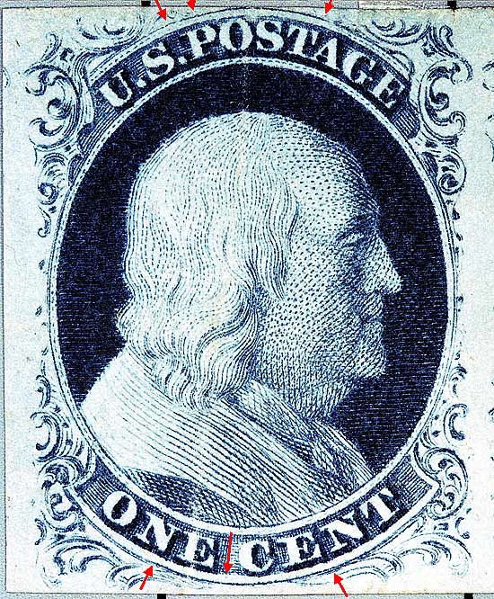 Figure 1. (Below) The only plating mark indicated in the plating diagrams is a small dot of color in the lower oval border between the "E" and "C." The red arrows indicate the approximate starting and stopping points of the recut curved lines. The top recut line is bends downward over the "P" of POSTAGE and then high over "O." |