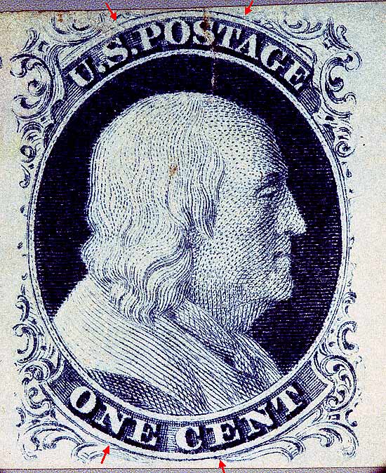 1¢ Franklin Issue of 1851-1857, PLATE 1 LATE. Pos 20L1L, (Scott #9) |