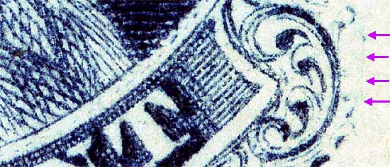 | Figure 1. (Below) Very weak vertical mark of color, east of Ornament "R." This is not shown on the plating diagrams and similar marks can be found on other positions.