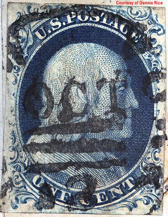 | Scott #9 Blue, Type IV, Relief B Issued both imperforate and perforated. Perforated copies are more scarce. SINGLE RECUT TOP, DOUBLE RECUT BOTTOM |