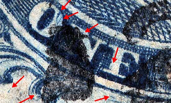 | Figure 2. (Below) Detail view DOUBLE TRANSFER marks. Most prominent are the marks in the "O" of ONE.