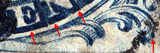 | Figure 3. (Below) Detail view DOUBLE TRANSFER marks. Most prominent are the dropped shadows under the "E" and "N" of CENTS. The SCROLL is also doubled as is the right PLUME.