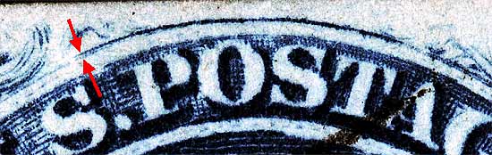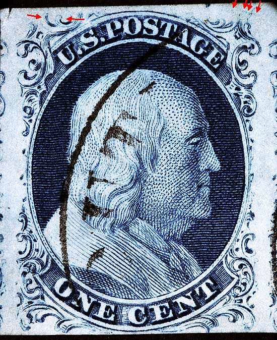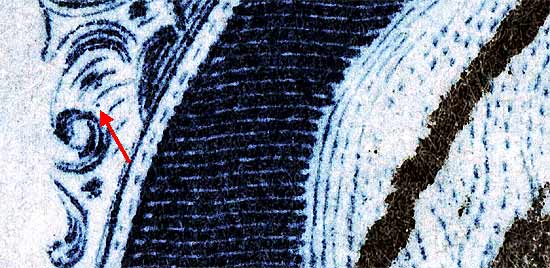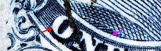 | Figure 3. (Below) Plating mark as indicated in the Ashbrook/Neinken plating diagrams. (red arrow) The dot above the "E" of ONE (violet arrow) is noted for further study and may not be consistent or reliable.