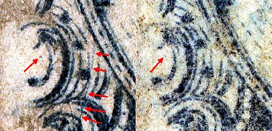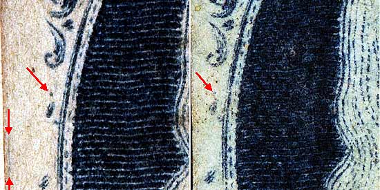 | Figure 1. (Below) Detail view of plate crack. Early printings (left image below) do not shown this crack well or at all. There is also a small dot on the inside of Ornament "F."