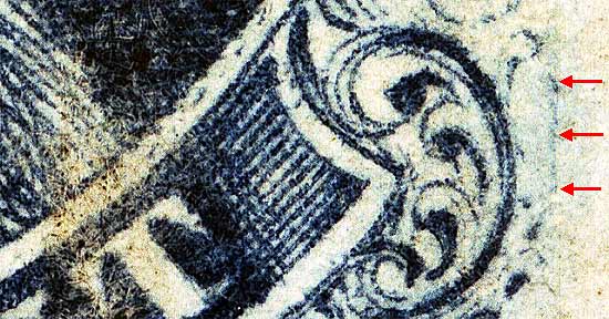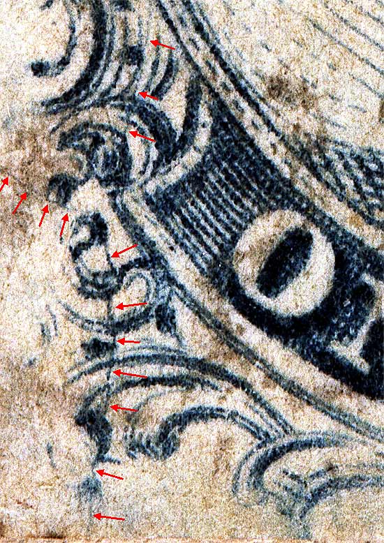 | Figure 3. (Below) Detail view of plate crack. Early printings do not shown this crack.