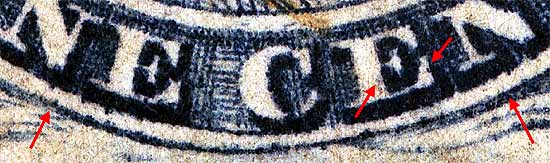 | Figure 2. (Below) Detail view of various plating marks. The second recut line can be seen connecting the "E" of ONE and the "C" of CENT.