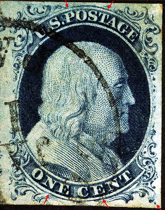 | Scott #9 Blue, Type IV, Relief B Issued both imperforate and perforated. Perforated copies are more scarce. SINGLE RECUT TOP (doubled) Late impressions of this position show fine cracks in Ornament "N" and 2 cracks cutting through Ornaments "H and K." |