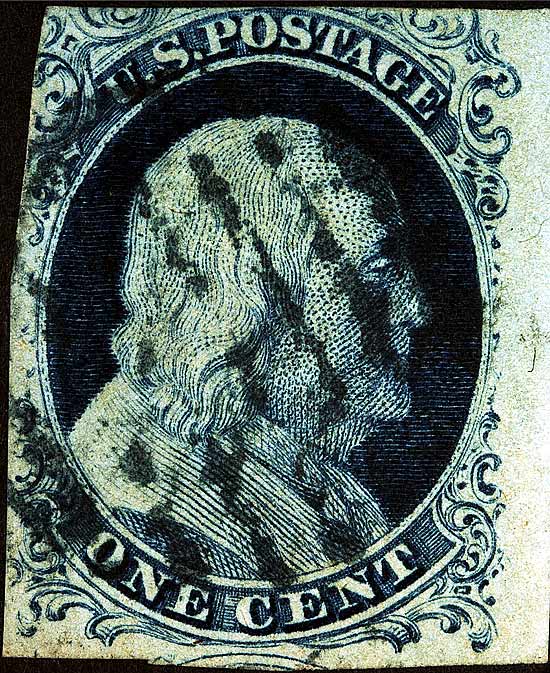 | Scott #9 Blue, Type IV, Relief B Issued both imperforate and perforated. Perforated copies are more scarce. SINGLE RECUT TOP ONLY On late impressions of this position, a surface carck can be seen in the upper left corner. This is the extension of the crack from Position 40L1L. |