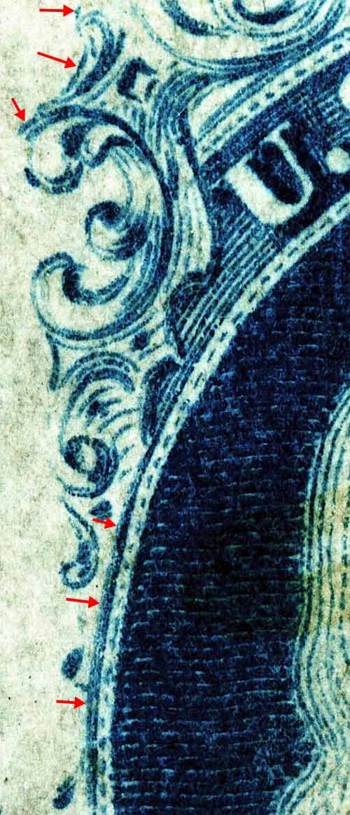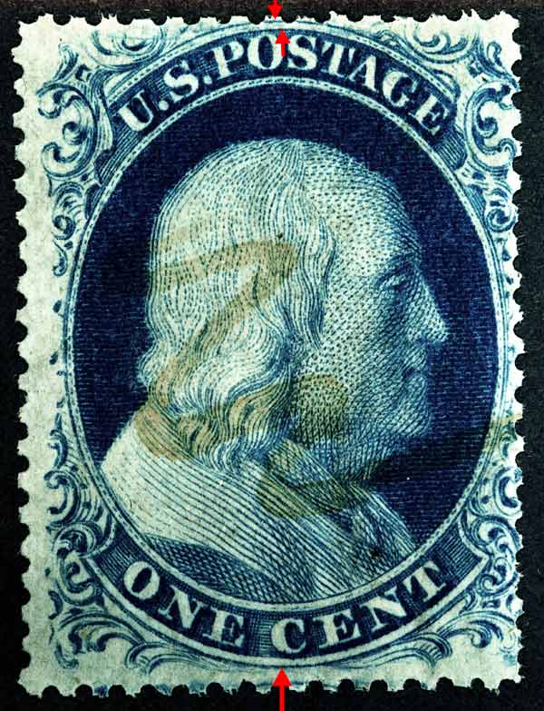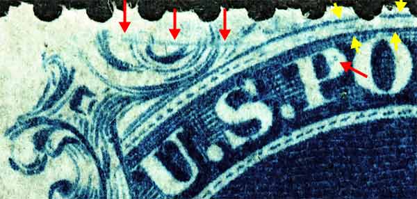 | Figure 1. (BELOW). Detail view of TOP DOUBLE RECUT LINES (Yellow arrows) and plating marks (Red) The marks in the "P" of POSTAGE appear to be rust marks.