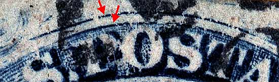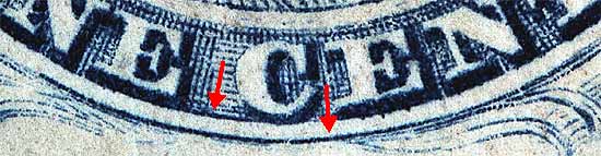 | Scott #9 Blue, Type IV, Relief A Issued both imperforate and perforated. Perforated copies are more scarce. DOUBLE RECUT TOP There are two positions on Plate 1L that are recut twice at the top and twice at bottom. These are: 52L1L and 79L1L. Both positions are "A" Reliefs. This recutting was probably not by accident as "A" reliefs on the transfer roll already had a shorter and weaker design at top and bottom than the "T" and "B" reliefs. |