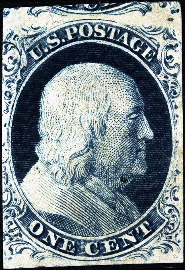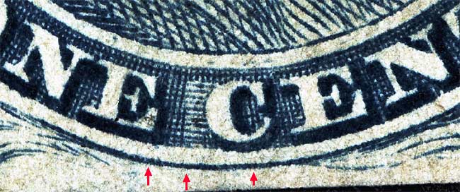 | Scott #9 Blue, Type IV, Relief A Issued both imperforate and perforated. Perforated copies are more scarce. SINGLE RECUT TOP The bottom recut line is very low under and between "E and C". |