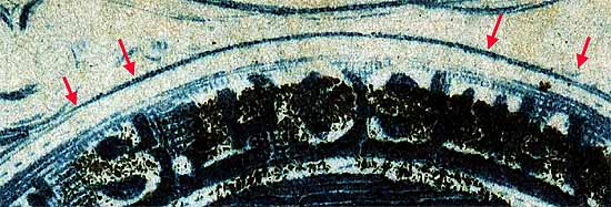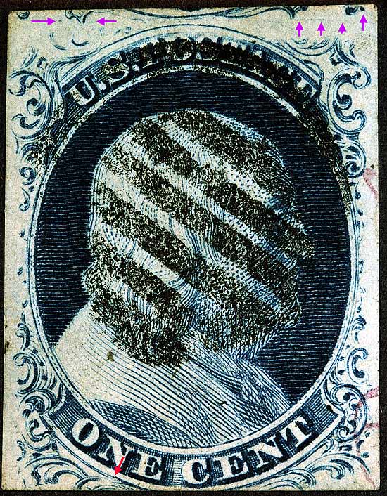 | Scott #9 Blue, Type IV, Relief A Issued both imperforate and perforated. Perforated copys are more scarce. SINGLE LONG RECUT TOP Note that the background over the "O, S and T" of POSTAGE is faint. This is more appearent on later impressions. The violet arrows indicate Neinken/Ashbrook plating marks found on Position 48L1L. |