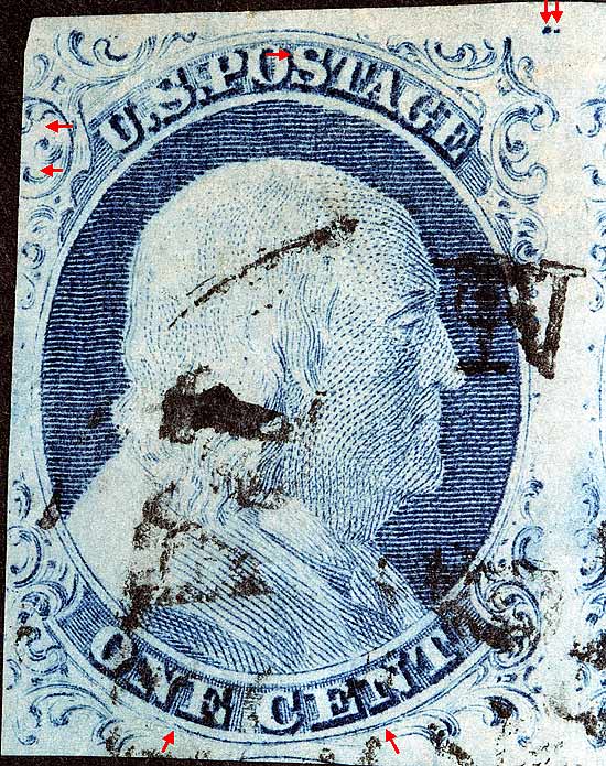 1¢ Franklin Issue of 1851-1857, PLATE 1 LATE. Pos 5L1L, (Scott #9) |
