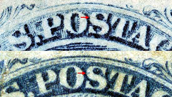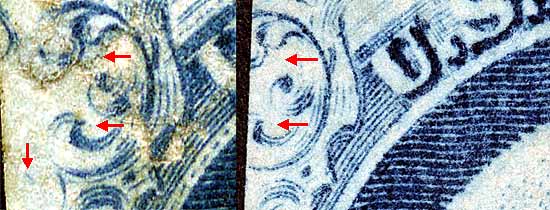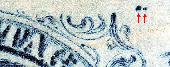 | Figure 2. (Below) Detail of plating marks in Ornaments A/B. As the plate wears the intensity of these small dots diminishes. The diagonal dash plating mark below and to the left of Ornament B is not illustrated in the Plate 1Late plating diagram. However it is illustrated in the Plate 1 Early diagrams. In fact, many deep plating marks found on Plate 1 Early can be found on there Plate 1 Late counterparts.