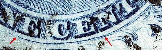 | Figure 4. (Below) Detail view of the BOTTOM RECUT curved line. Only positions 4, 5 and 8 of the top row LEFT pane have a SINGLE RECUT bottom curved lines. This can be an aid to plating top row positions of this pane.