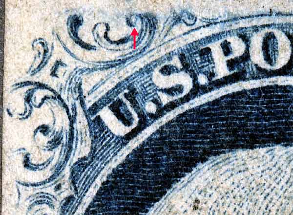 | Scott #9 Blue, Type IV, Relief B Issued both imperforate and perforated. Perforated copies are more scarce. SINGLE RECUT TOP, Part of a Horizonal pair. See 70R1L |