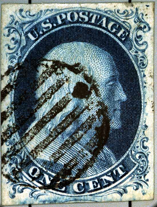 | Scott #9 Blue, Type IV, Relief T Issued both imperforate and perforated. Perforated copys are more scarce. DOUBLE RECUT BOTTOM CURVED LINE |