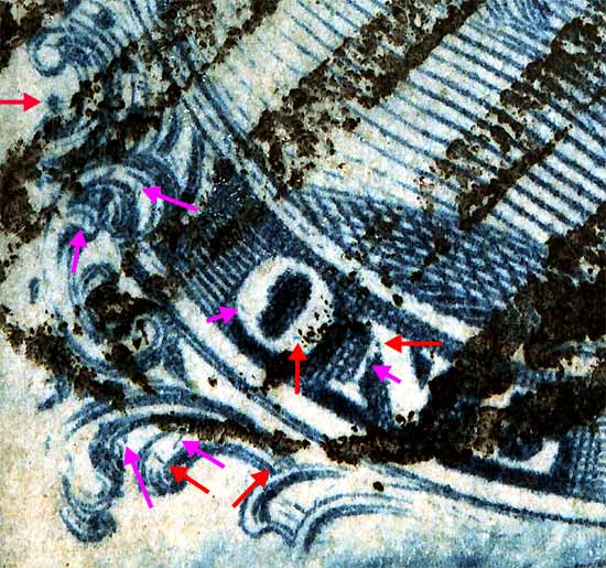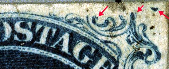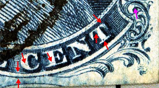 | Figure 2. (Below) Red arrows indicate plating marks in Ashbrook/Neinken drawings. Violet arrows are marks not shown in plating drawings and may not be constant. Only positions 1, 2, 3, 6, 7, 9 and 10 of the LEFT pane have a DOUBLE RECUT bottom curved lines. This can be an aid to plating top row positions of this pane.