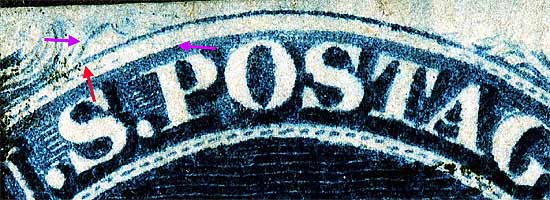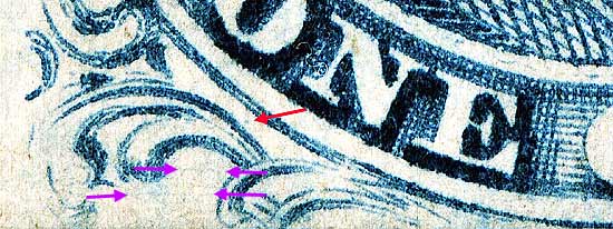 | Figure 2. (BELOW). Slight splitting of the top recut line. There is also a fine horizontal scratch above the "S and P." (See violet arrows)