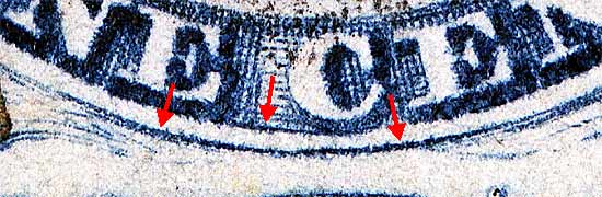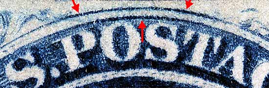 | Scott #9 Blue, Type IV, Relief A Issued both imperforate and perforated. Perforated copys are more scarce. DOUBLE RECUT TOP, There are two positions on Plate 1L that are recut twice at the top and twice at bottom. These are: 52L1L and 79L1L. Both positions are "A" Reliefs. This recutting was probably not by accident as "A" reliefs on the transfer roll already had a shorter and weaker design at top and bottom than the "T" and "B" reliefs. |